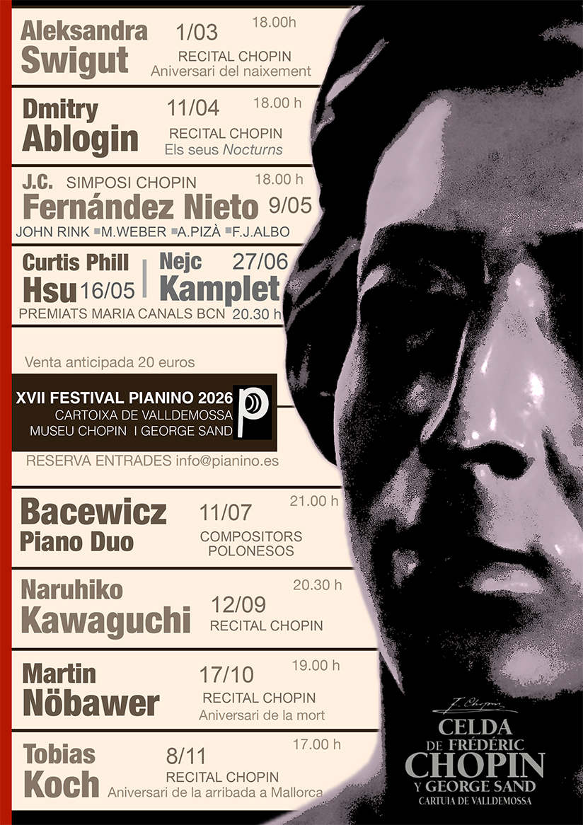 Aquest diumenge 1 de març de 2026, a les 18.00 hores, comença el XVII Festival Pianino a la Cel·la de F.Chopin i G. Sand de la Cartoixa de Valldemossa. Com és habitual, el Festival s'inaugura el dia de la celebració del naixement de F. Chopin i que, a més, és el dia de les Illes Balears.