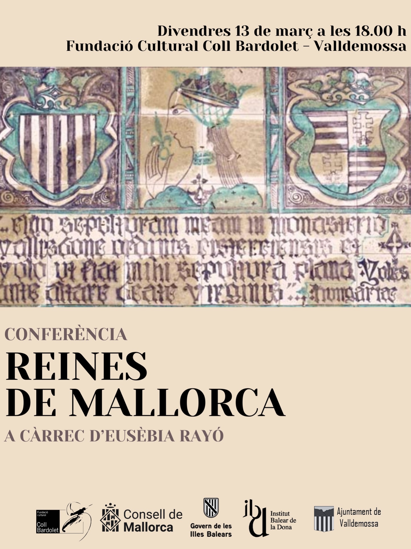 El pròxim divendres 13 de març a les 18.00 h tendrà lloc a la Fundació Cultural Coll Bardolet la conferència "Reines de Mallorca" a càrrec d'Eusèbia Rayó, comissària de l'exposició i autora del llibre Reines de Mallorca a l'ombra del poder. Aquesta xerrada inaugura el programa d’activitats vinculat a l’exposició “Dones i Reines de Mallorca”, que es podrà visitar a la Fundació durant els mesos de març i abril.