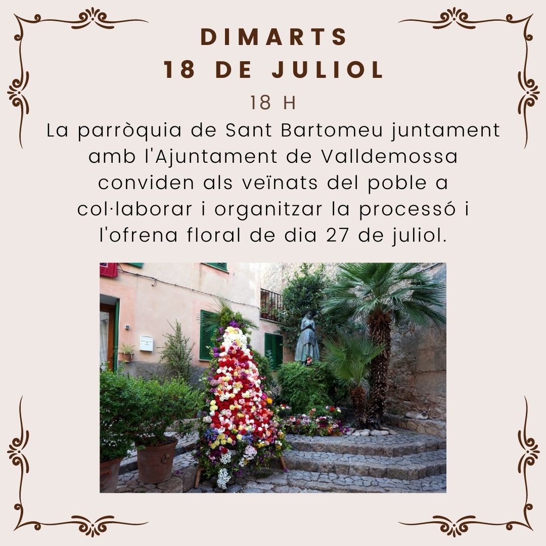La parròquia de Sant Bartomeu juntament amb l'Ajuntament de Valldemossa conviden als veïnats del poble a col·laborar i organitzar la processó i l'ofrena floral de dia 27 de juliol.