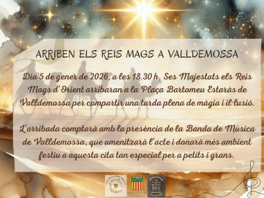 Dia 5 de gener de 2026, a les 18.30 h, Ses Majestats els Reis Mags d’Orient arribaran a la Plaça Bartomeu Estaràs de Valldemossa per compartir una tarda plena de màgia i il·lusió.