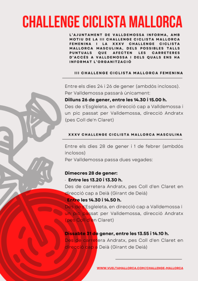 L'Ajuntament de Valldemossa informa amb motiu de la celebració de la III Challenge Ciclista Mallorca Femenina i la XXXV Challenge Ciclista Mallorca Masculina, dels possibles talls puntuals que afecten les carreteres d'accés a Valldemossa i de les quals ens ha informat l'organització.