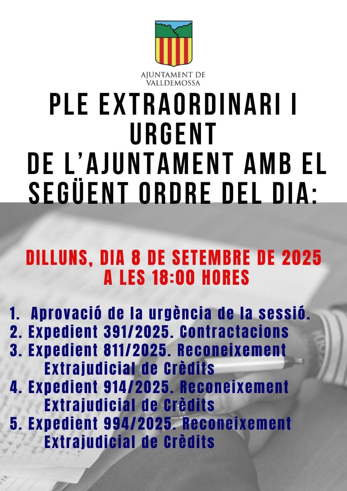 el proxim dilluns 8 de setembre es celebrara un ple extraordinari i urgent