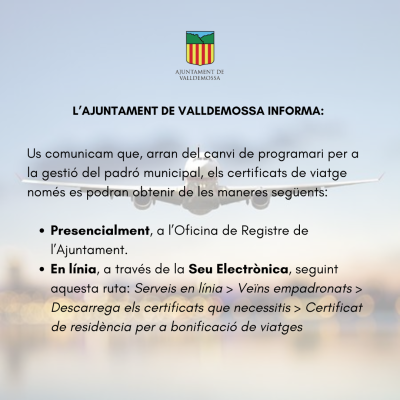 Us comunicam que, arran del canvi de programari per a la gestió del padró municipal, els Certificats de Viatge només es podran obtenir mitjançant les opcions següents: